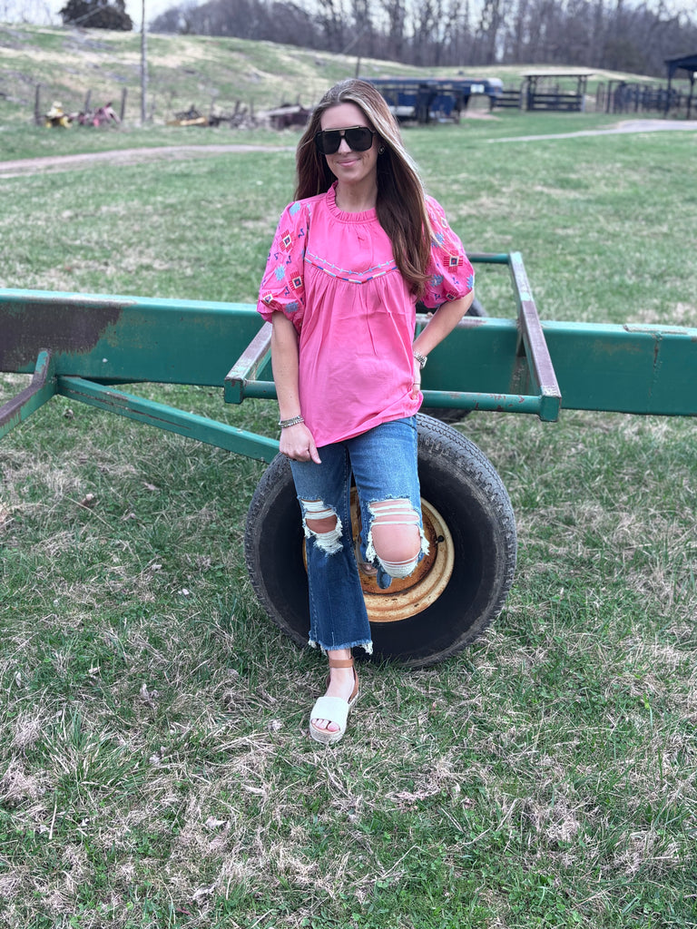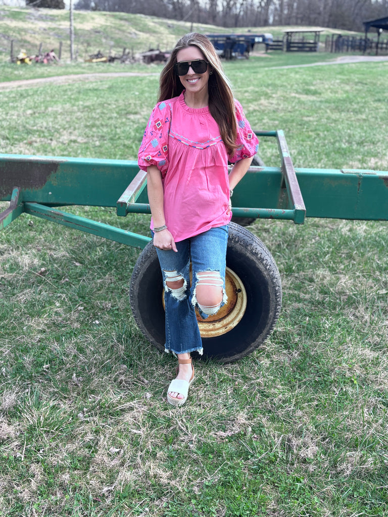 The sleeve detail on this top is beautiful! The prettiest bubblegum pink with embroidery southwest detailing on the sleeves. Relaxed fit, but still recommend sticking to your most true size. 100% polyester.