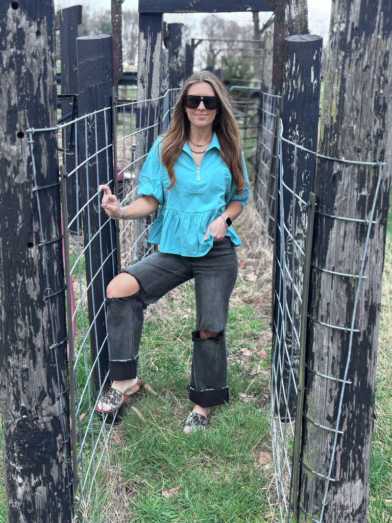 This is the prettiest powder blue color ever! This top is so fun. She has a quarter zip plum body style with fun stitching details. She has a linen feel, but is 100% cotton. We recommend sticking to your most true size.