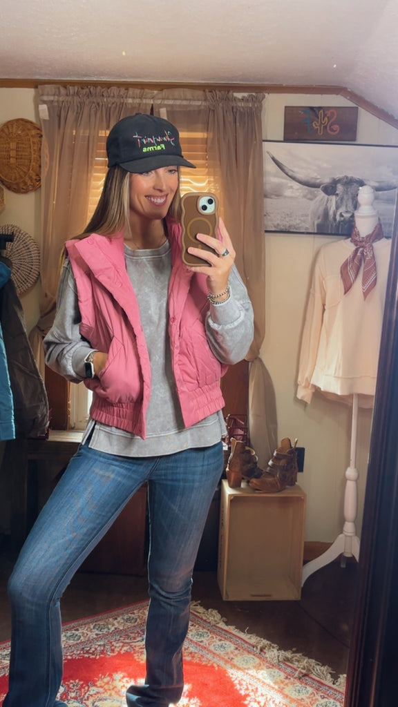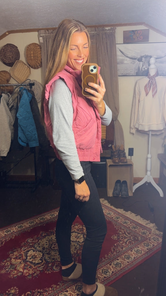 Palmer Pink Puffer VestYou guys already know that I am not a big pink girl, but I 100% love these! The color is perfect and the quality is unmatched. Fits true to size. Model is a small and wearing the small.